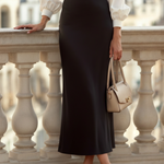 Gonna lunga in seta dal design essenziale e raffinato, pensata per valorizzare la silhouette con naturale eleganza.